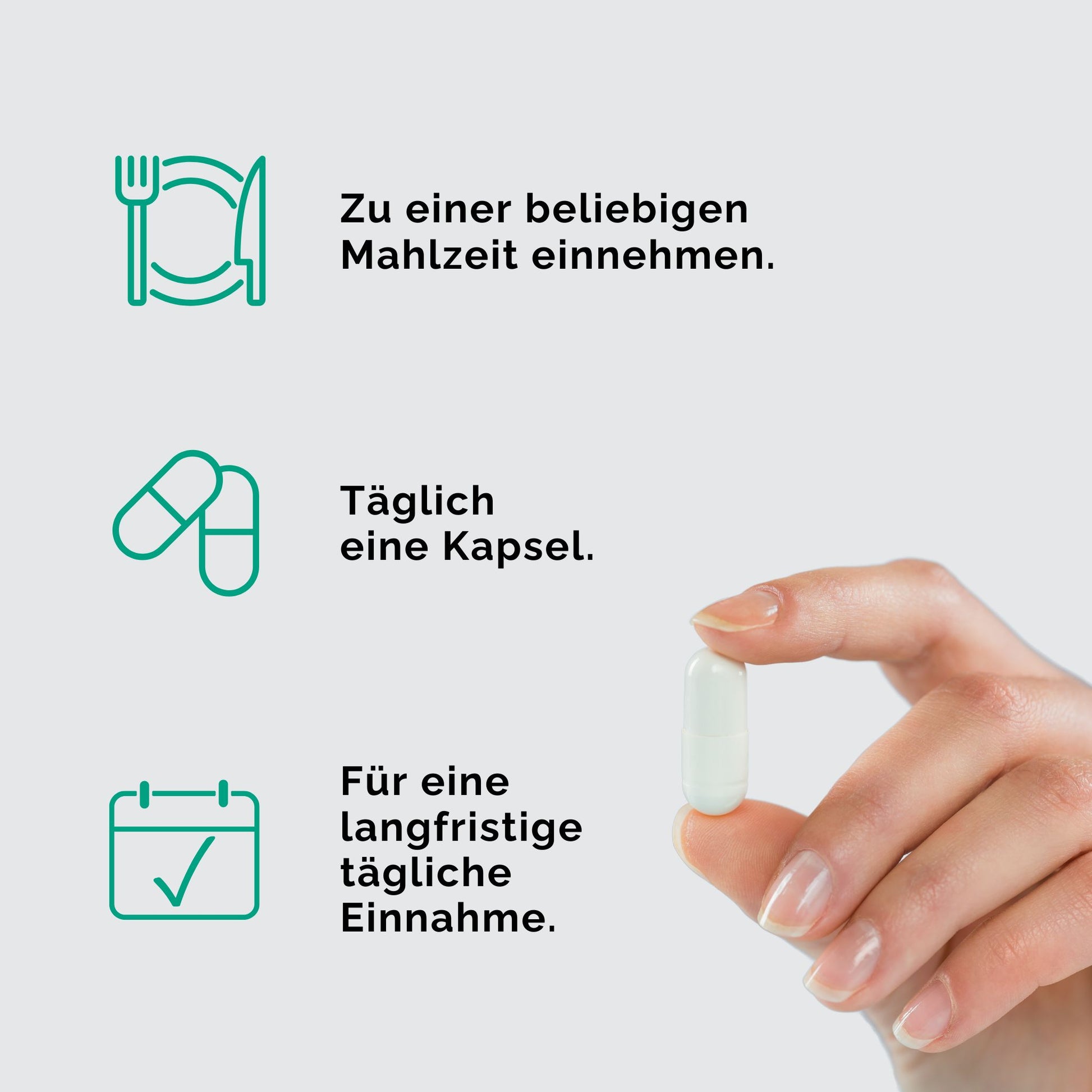 1x täglich eine Kapsel mit genügend Flüssigkeit zu einer beliebigen Mahlzeit einnehmen.